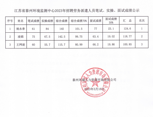 根據(jù)《江蘇省泰州環(huán)境監(jiān)測中心2023年招聘勞務(wù)派遣人員公告》規(guī)定,現(xiàn)將擬聘用人員公示如下: