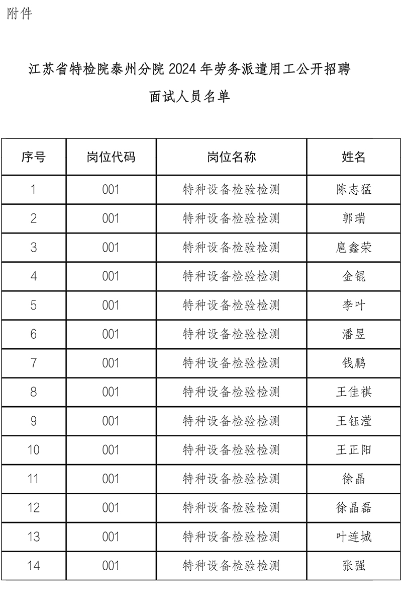 根據(jù)《江蘇省特種設(shè)備安全監(jiān)督檢驗研究院泰州分院2024年勞務派遣用工招聘公告》,經(jīng)資格審核,現(xiàn)將參加面試人員名單予以公示(名單附后)。面試時間、地點另行通知。